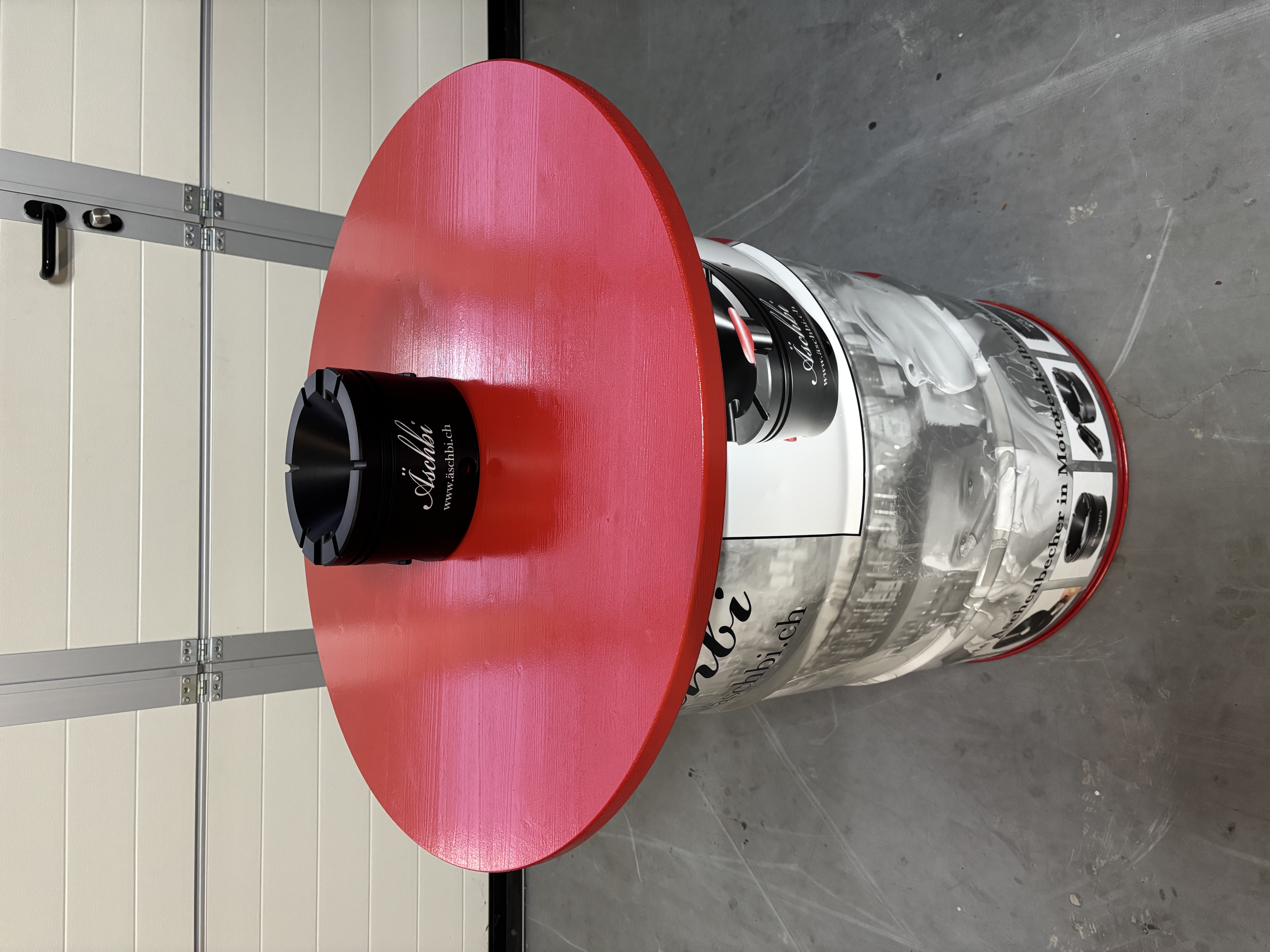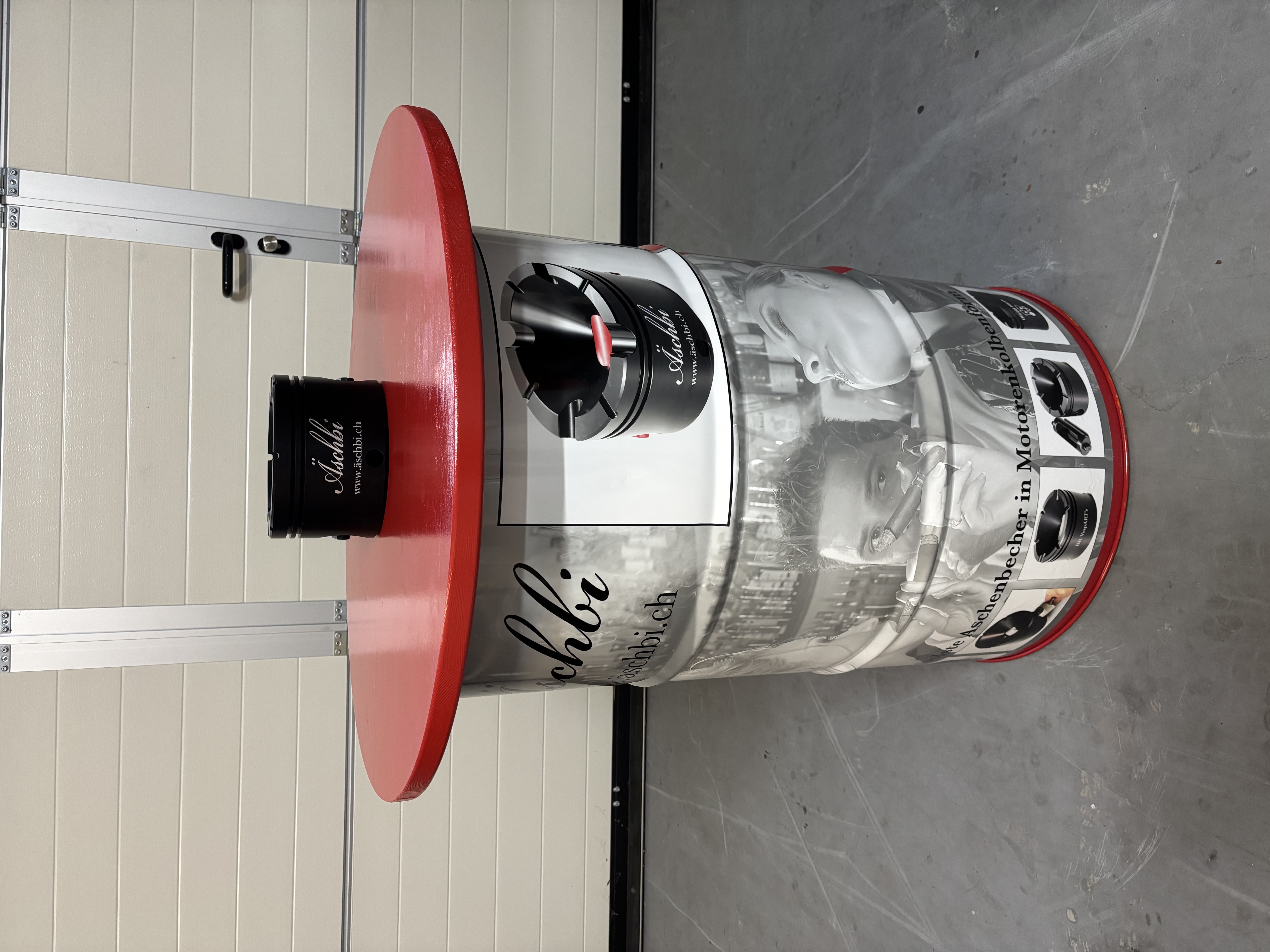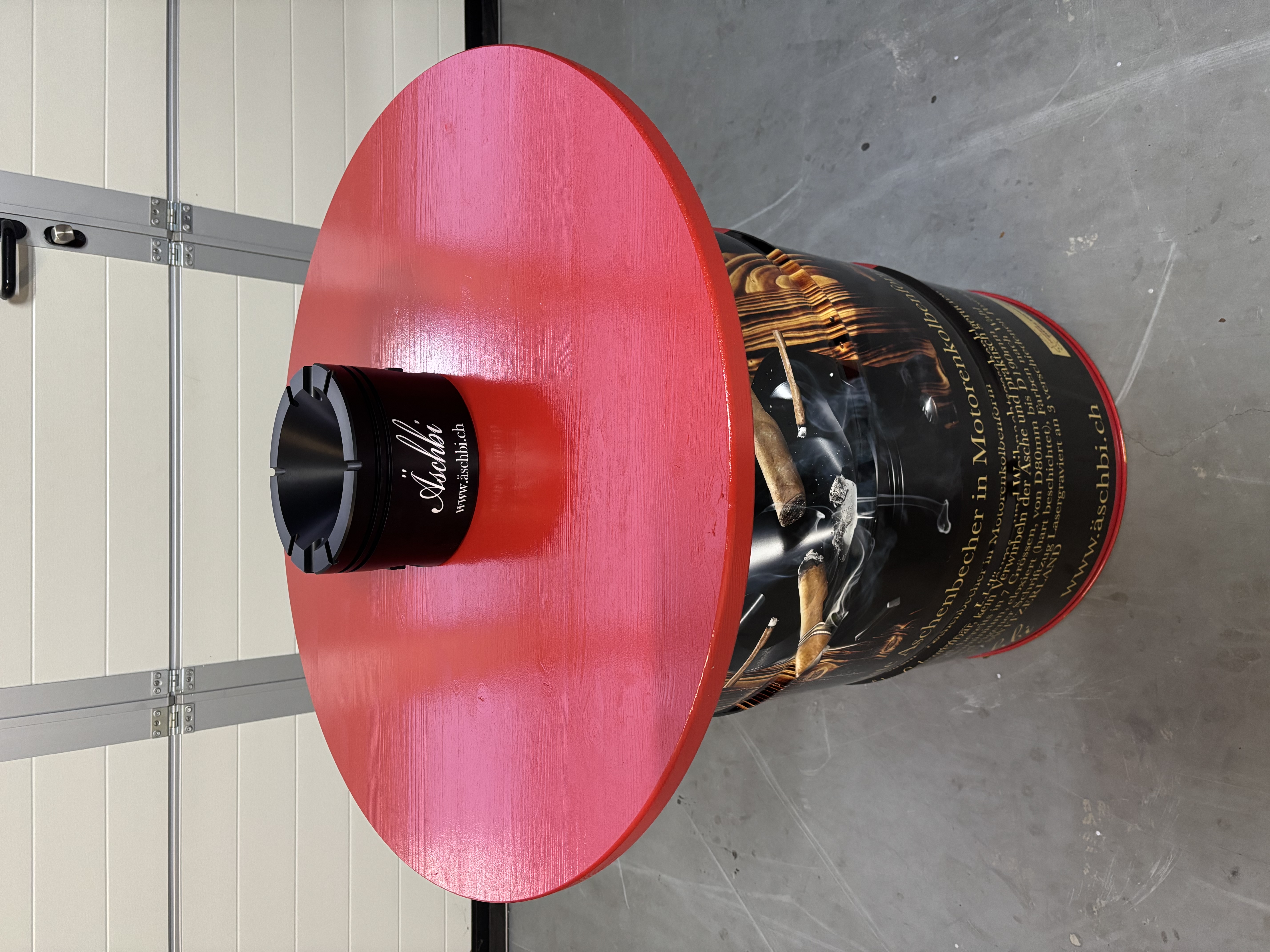 The weather-resistant bar table is made from a used, empty, and undented red steel barrel, printed all around with two black-and-white Äschbi motifs, and fitted with a red lacquered wooden tabletop with a diameter of 800 mm. The barrels are cleaned and sourced from NEW PROCESS in Felben-Wellhausen, Switzerland.